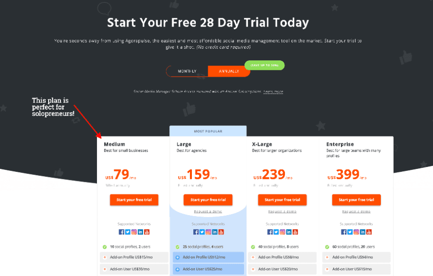 If you’re looking to try Agorapulse before buying a subscription, they offer a 28-day trial. After that, there are four pricing tiers. The most popular tier is the Large, with 25 social profiles and 4 users.