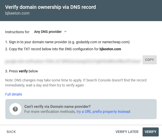 If you choose to verify by URL Prefix, the options are much more user-friendly an HTML meta tag in the site’s <head>, you can link it to an existing Google Analytics account, use the Google Tag Manager account, or use DNS verification like above.