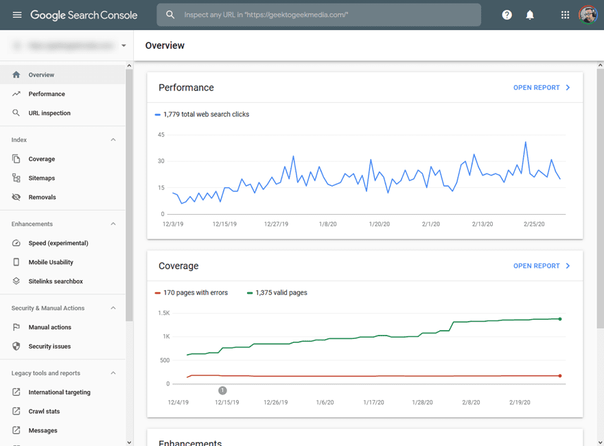 As we mentioned above, the left sidebar of the Search Console dashboard is rife with options and information. The default Overview tab gives you three cards that encapsulate the most common reasons folks use the service: Performance, Coverage, and Enhancements.