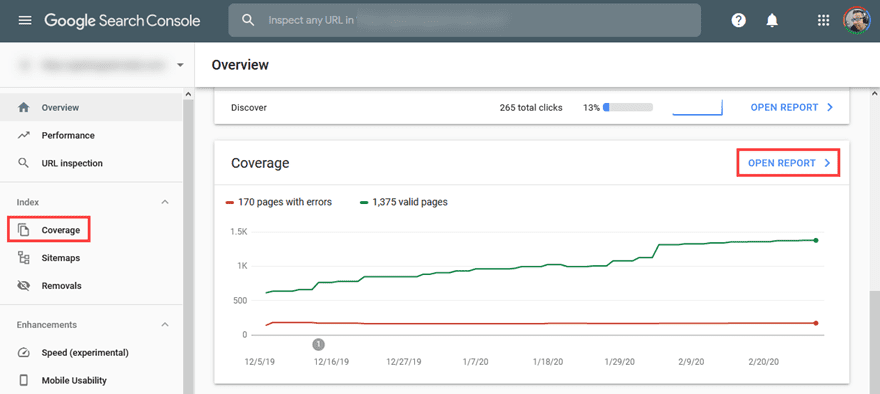 The second card on the Google Search Console dashboard overview is Coverage. And again, it also lives in the left-hand sidebar, just under URL Inspection. The Open Report link takes you to the same page, as before.