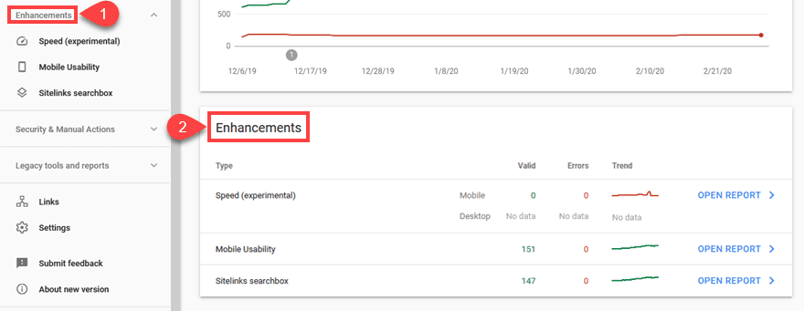 The third and final card on the dashboard overview is Enhancement. The reports covered in this section are about what you can do to better improve — or enhance — your website across multiple avenues. Speed being the first, mobile usability, as well as sitelinks.