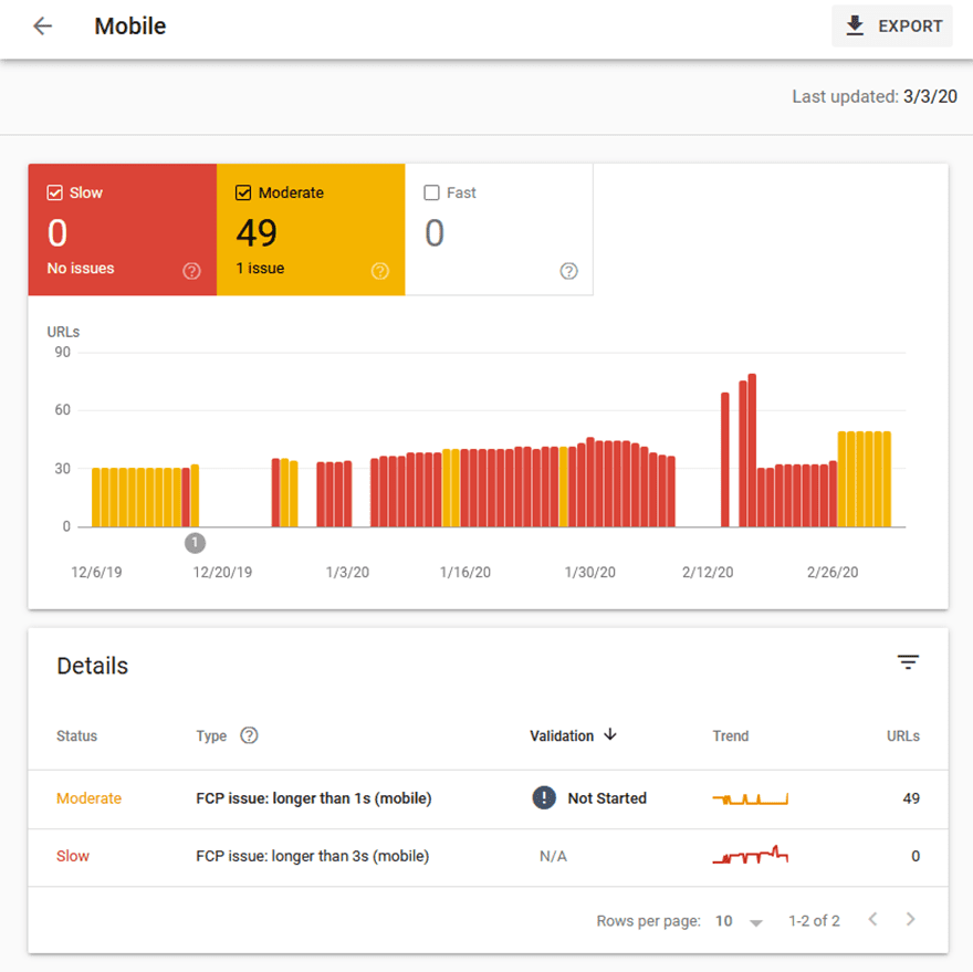As you can see in the above mobile report, in mid-February, the site incorporated a new caching plugin, moving all the indexed pages to Moderate from Slow. With a few tweaks, the site admins haven’t taken the time to make because Page Speed has typically run at about 1.5 seconds.