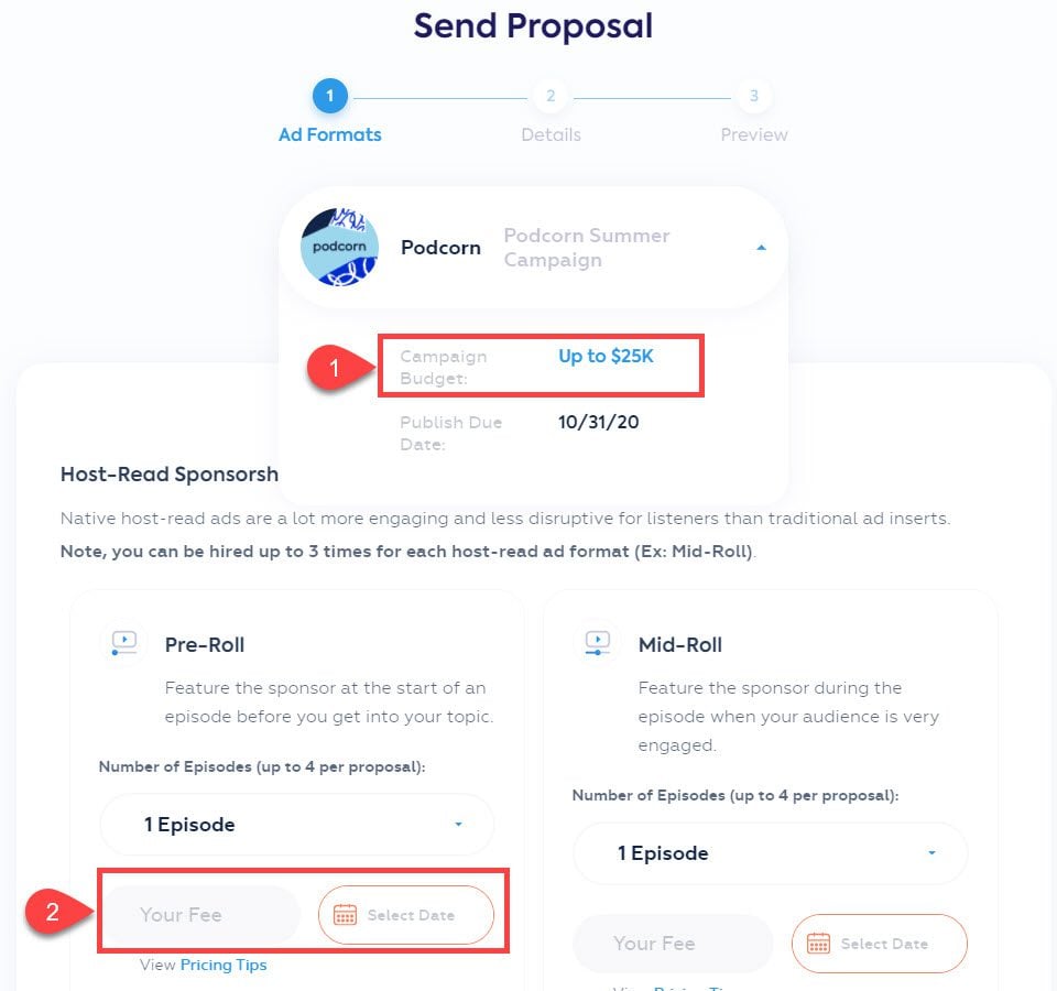 You do set your own prices here, and that’s because podcast sponsorships are based on a CPM model, or X amount per 1,000 listens. And that’s why you need your analytics connected. Once you choose what to commit to, you need to actually write or record your proposal.