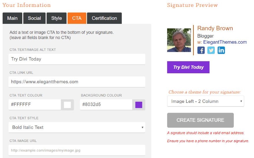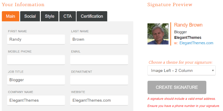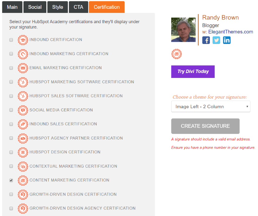 Email Signature Template Generator from HubSpot is a free tool with image layout options, social icons, styling, a call to action, and certifications. Itβs intuitive and it provides HTML that you can copy and paste. This generator requires you to include an email address and only has one typeface, but you if youβre familiar with HTML you can customize it easily.