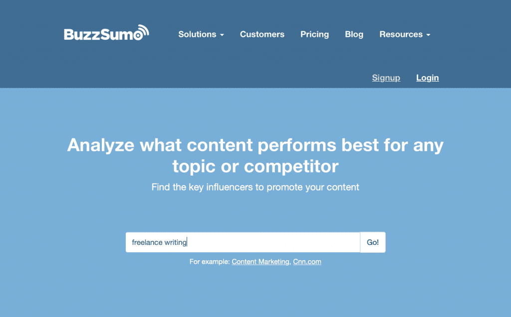 I love content analytics tools, so let’s take a look at BuzzSumo. I’m a freelance writer, so that’s the topic I search for.