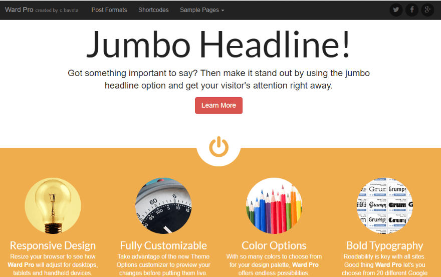 Ward is a free theme listed at the WordPress.org theme directory. Despite its price tag, it still packs an attractive flat design, as well as some helpful added functionality.