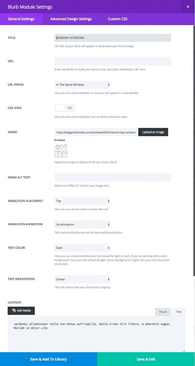 As mentioned before, there are two modules inside of each column. The first chunk of content is made up of a Blurb Module with a custom image, title, and content. The title and content have been styled via the Advanced Design Settings in the image below on the right. Because each column has a different background color, all three blurbs have different advanced color values.