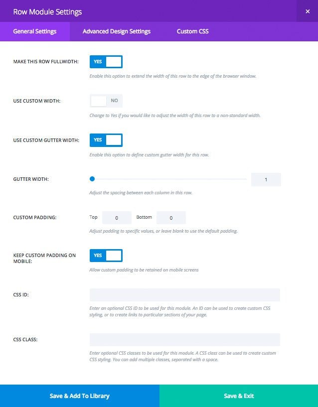 General Row Settings – I turned on “Make Fullwidth” and used a custom gutter width of ‘1’ in the Row Settings so that no matter what the user’s browser width is, the 3 columns span the fullwidth. Note that a gutter width value of ‘1’ removes all the space between columns.