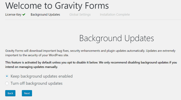 Here you can choose to allow Gravity Forms to automatically update (this is the default setting and is recommended) or you can perform the updates manually. I recommend keeping the default setting and selecting Next.