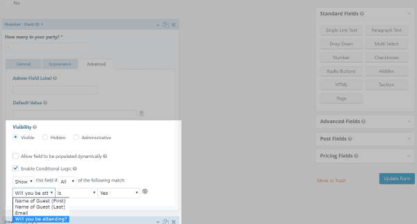 This form includes several conditional logic elements. It will only ask how many in your party if you are attending, and it will only ask for food choices if you are dining.