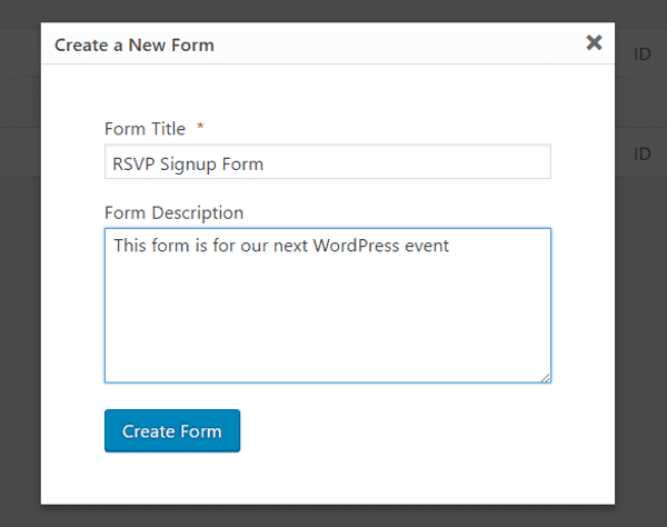 Select New Form (under Forms in the dashboard menu) and youβll get a popup where you can name your form and give it a description.