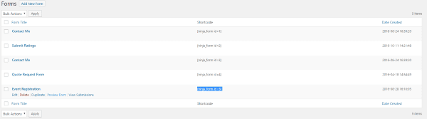 You’ll find the list of forms by clicking All Forms in the dashboard menu. Here you can select the shortcodes to paste into your content (in the Text tab of the editor, or Text or Code module in Divi). The forms list includes buttons to edit, delete, duplicate, preview, and view the submissions for each form from this list.
