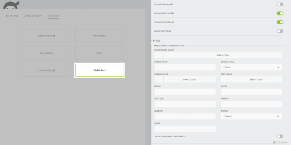 Here you can enable several settings for multi-part forms such as Validate Each Part, Show Breadcrumbs, Show Progress Bar, and Show Party Tiles. There’s also a styles settings for each to style container, buttons, hover, and active button. Each one has advanced CSS properties as well.