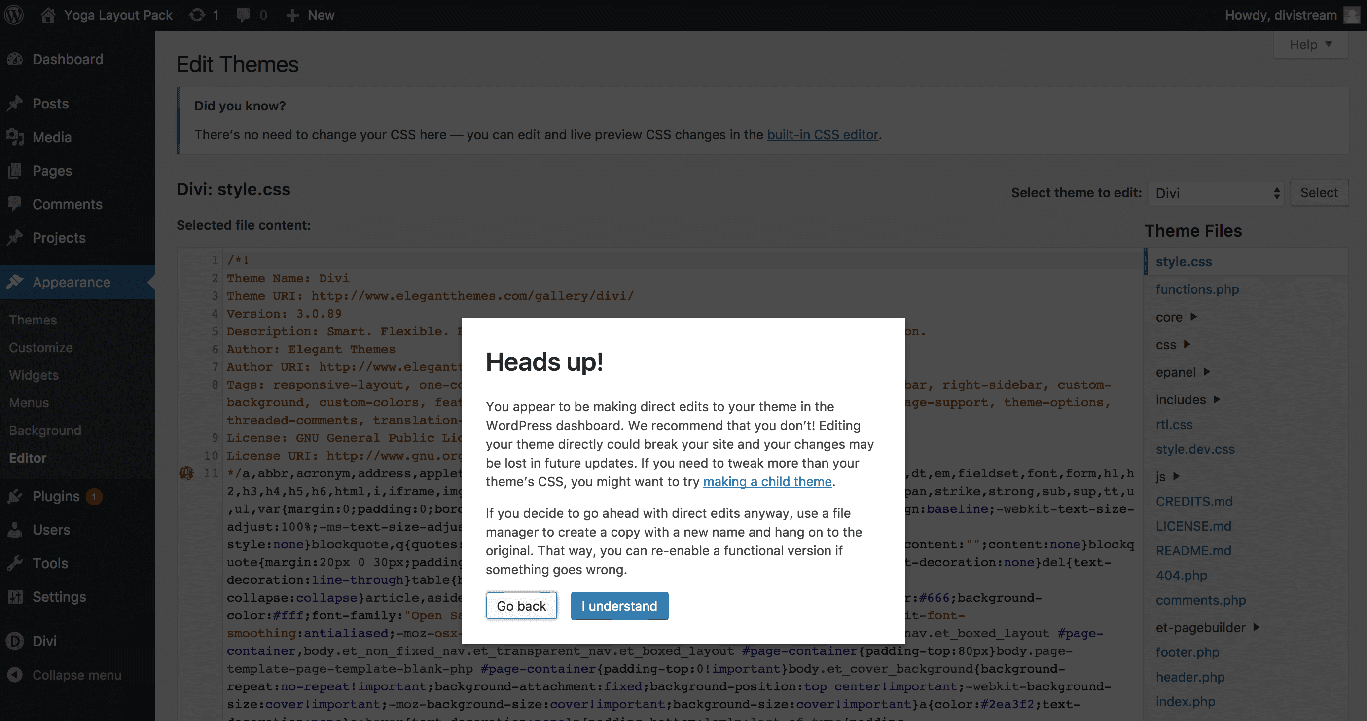 Okay, so looking at the picture above, you see that it would be pretty easy to just edit stuff, hit save, and take your chances. Now, however, you see this the moment you go into Appearance > Editor: