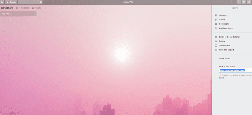 Next to your Board name, you will see Personal, which you can use to add people to your board. Also, Private which just means this board is currently only accessible to you. A drop-down menu lets you decide to add the board to a team or make it public as well.
