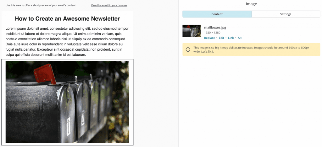 Back in MailChimp, we can either drop the image straight onto the image content block, or browse for the file.Β IfΒ you try to upload an image thatβs too wide, youβll get a notification to fix it: