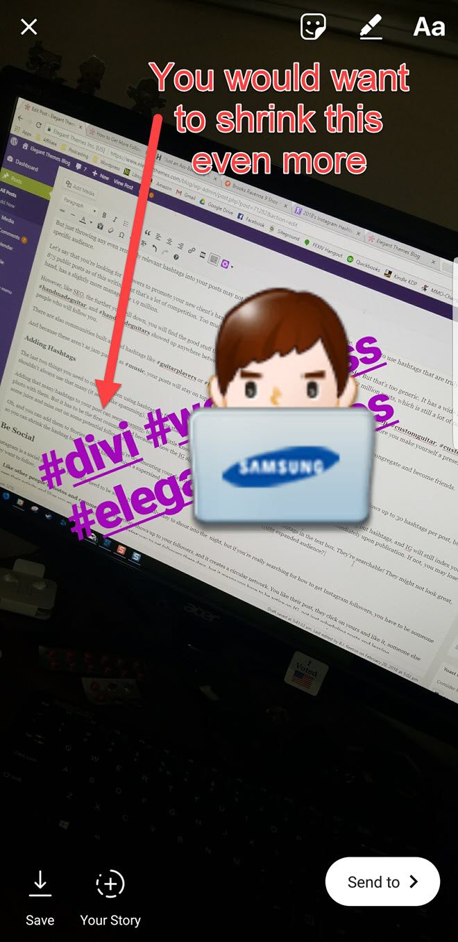 Oh, and you can add hashtags to Stories, too. So when you’re documenting your day or doing something silly or fun, put some hashtags in the text box. They’re searchable! They might not look great in your story’s composition, so you can shrink the hashtag box down and hide it behind a supersized emoji. Instant expanded audience (or is that Insta expanded audience?) who will see the real you and follow you — because your story proves that you’re too awesome not to follow.