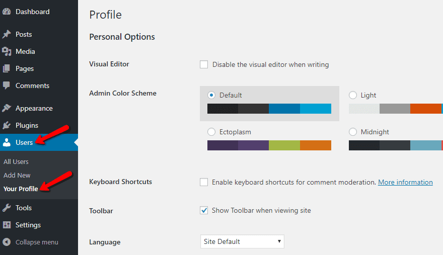 To do that, head to Users β Your Profile in your WordPress dashboard sidebar: