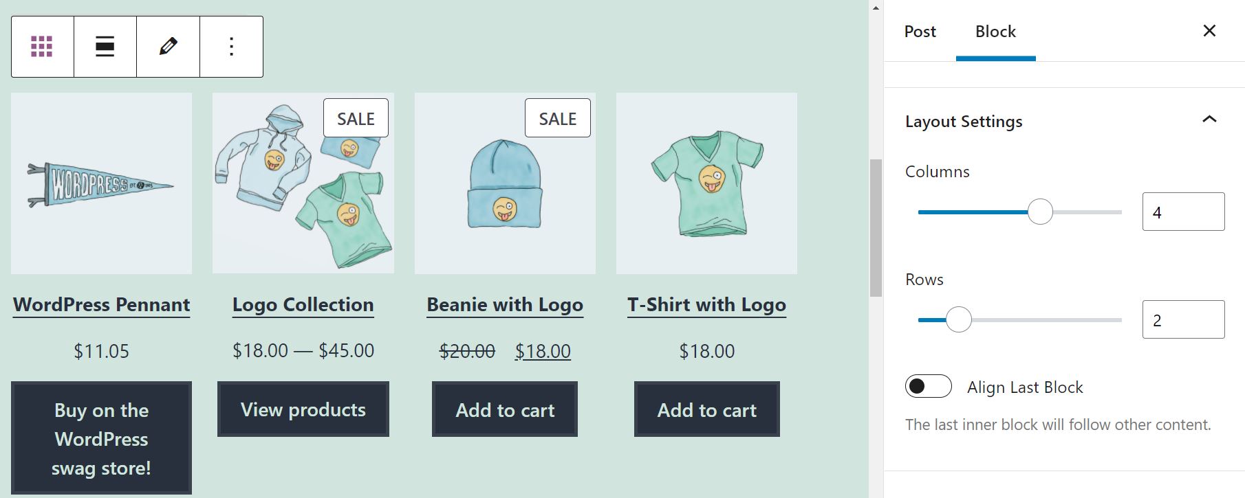 As the name suggests, the All Products block displays all of your WooCommerce products. Currently there isn’t an option to exclude certain products, or limit the number of items that appear in the block.