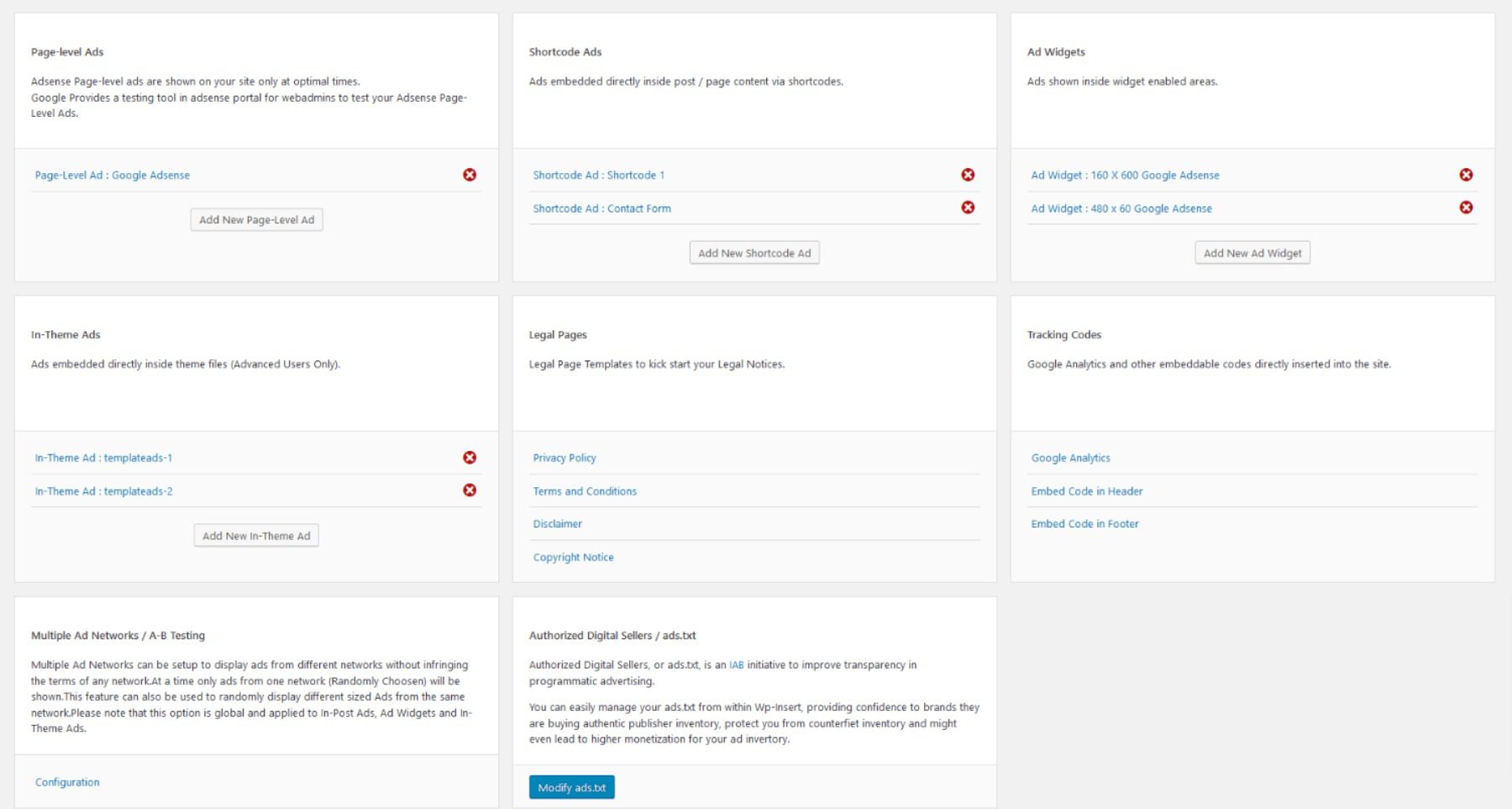 The settings screen provides tools for in-post ads, widgets, in-theme ads, shortcodes, AdSense auto ads, a/b testing, and more. It also includes templates for your legal pages, tracking codes, and a generator for your ads.txt.