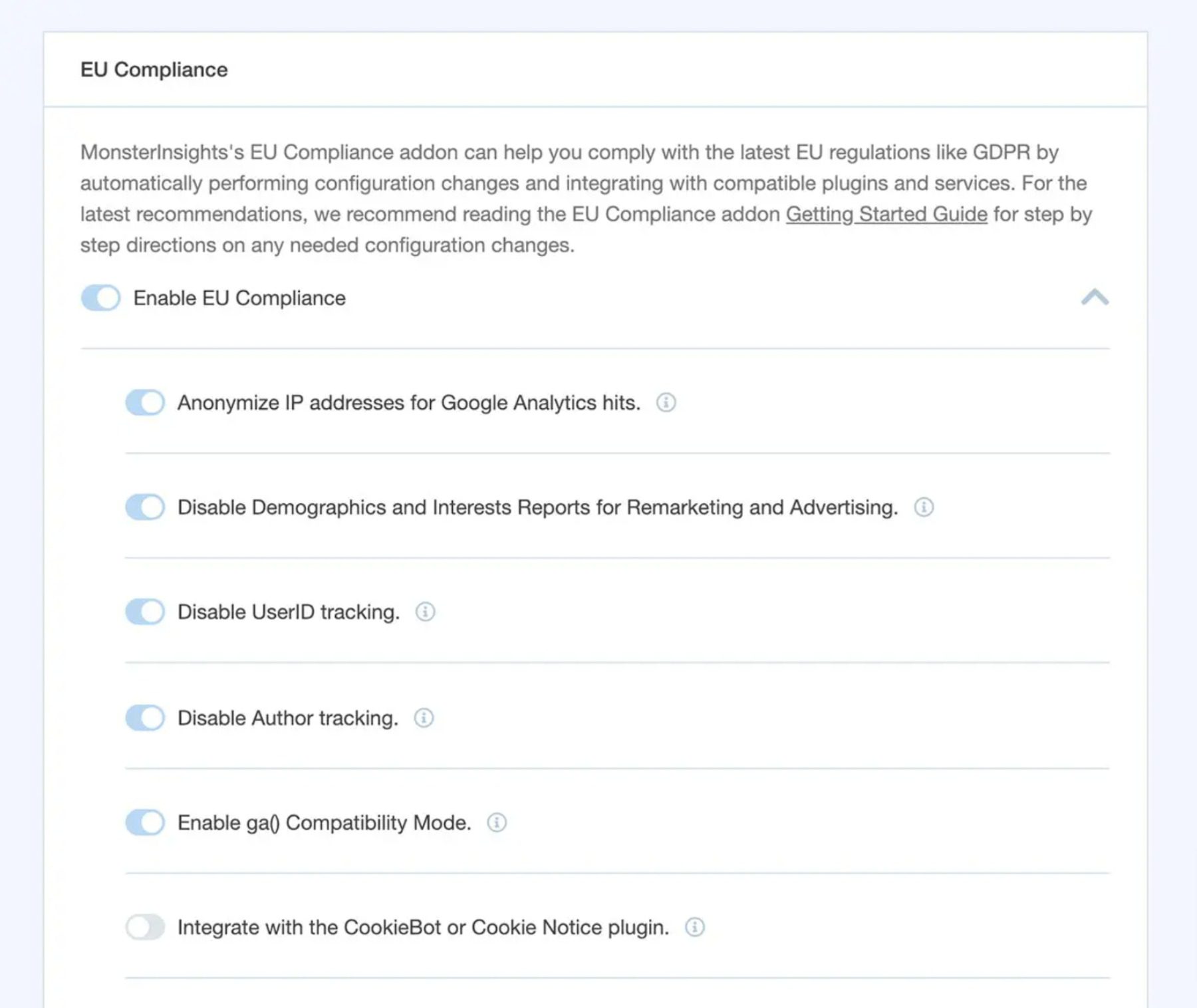 MonsterInsights is a popular WordPress plugin that provides comprehensive tracking and analytics capabilities for website owners. Besides that, it also offers an addon focused on EU compliance. Enabling this addon will help you make your Google Analytics compliant with GDPR.