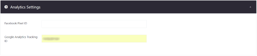 Analytics Settings includes fields for your Facebook Pixel ID and Google Analytics tracking ID.