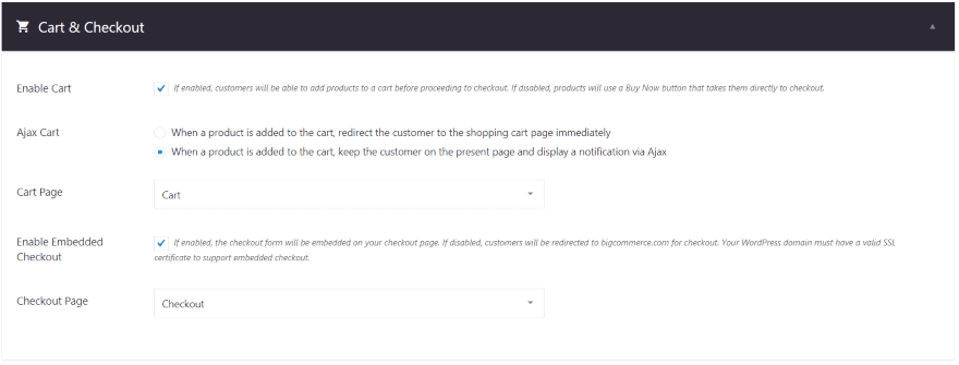 Cart and Checkout lets you enable the shopping cart and determine whether or not to use Ajax, which keeps the customer on the current page. You can also embed checkout and choose the cart and checkout pages.
