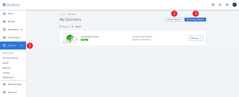 With Bluehost plans, you can add as many domains and subdomains as you would like. Your domains are easily accessible in the dashboard by clicking on Domains. Additional domains are easily purchased with the click of a button. Other options are assigning domains to sites, setting redirects, transferring domains, or adding subdomains.