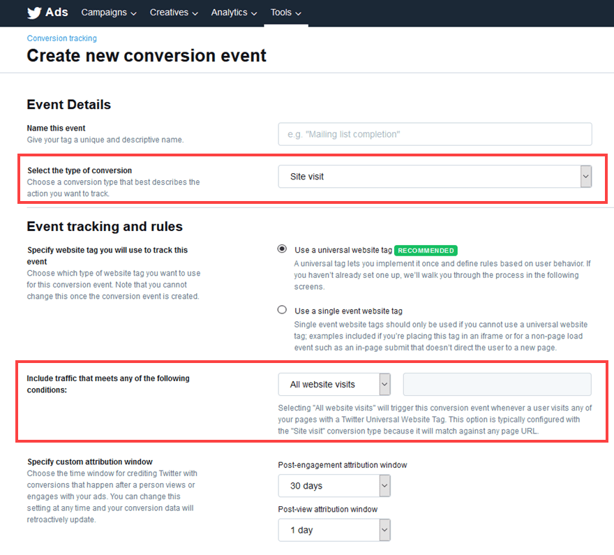 You can even set which criteria and conditions under which the URL will be tracked. Once you save this event, the Twitter website that you just put on your site will immediately start tracking your conversions.