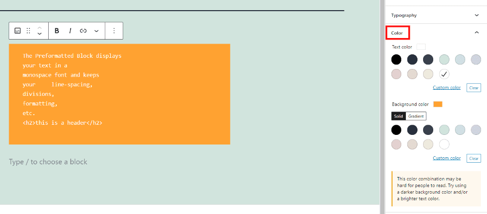 You can also add the block by typing /preformatted and hitting Enter in the content area where you want it to appear. As you type, WordPress will offer suggestions based on the letters you enter, so you can just click on the block when you see it.