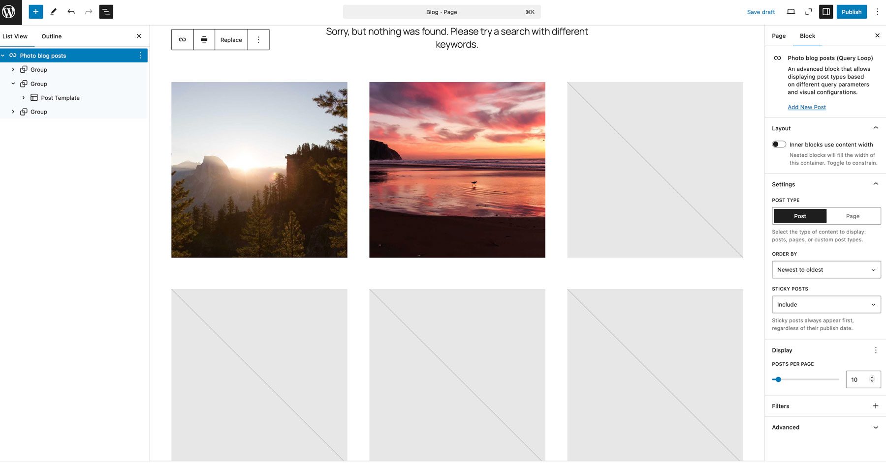 The block’s settings interface has been redesigned to provide more control over the loop’s appearance and how it functions. You can adjust the spacing between items and the column layout and choose to display posts, pages, products, and more. The sorting settings have been improved, too, where you can filter content by type, author, keyword, or format.