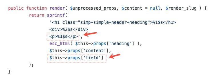 Here you can see how the output of the render() method of the php file corresponds to the output of the render() method of the php file which now includes the new field wrapped in a p tag.