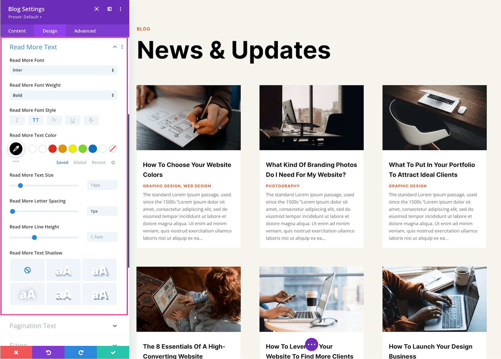 Inside this tab, you’ll find all the design styles and options for the Blog module.