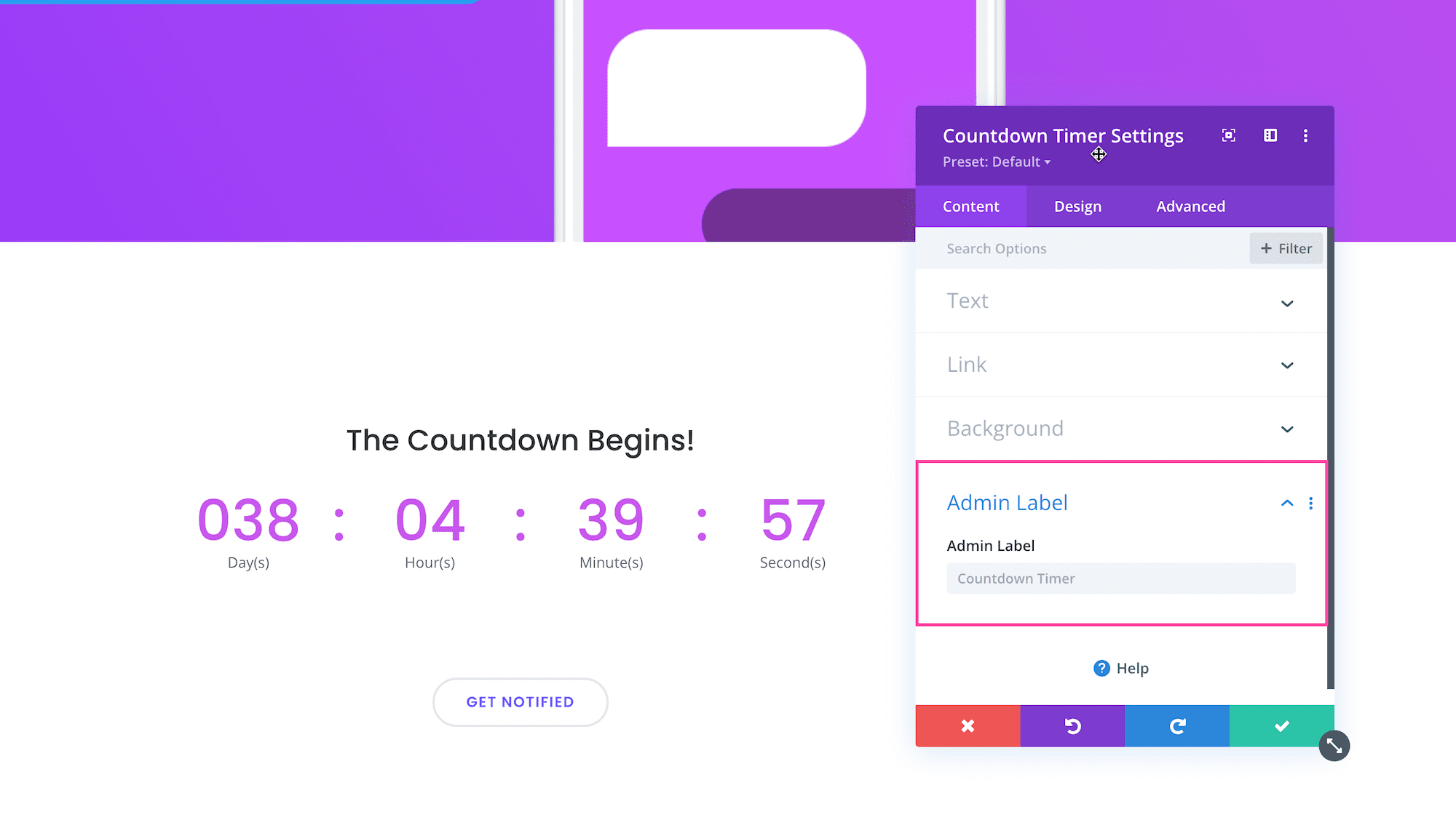 Once you’ve added the countdown timer module, the module settings automatically pop up. This is where all of the content and design styles for this module are configured. These settings are organized into three groups via the tabs at the top of the module: Content, Design, and Advanced.