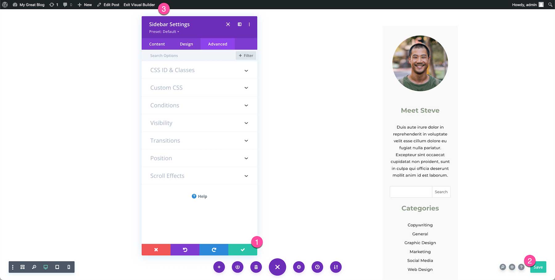 Now that all your changes are saved, click “Exit Visual Builder” on the admin toolbar at the top to exit the Visual Builder.