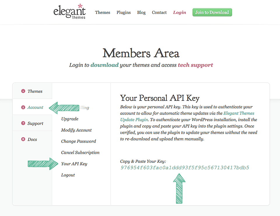 Before you can update your theme or plugin, you must first authenticate your Elegant Themes subscription. Only members with active accounts have access to product updates. To authenticate your account, you will be asked to input two pieces of information into your theme or plugin settings panel: 1) Your Username and 2) Your API Key. Your username is the same username you use when logging in to your ElegantThemes.com account, and your API Key is a unique identifier used to authenticate your account that is only available to you when logging in. To locate your API Key, log in to the Elegant Themes members area and click on the Account > Your API Key link. Copy the API Key displayed on the page. You will by pasting this key into your Theme or Plugin options page.